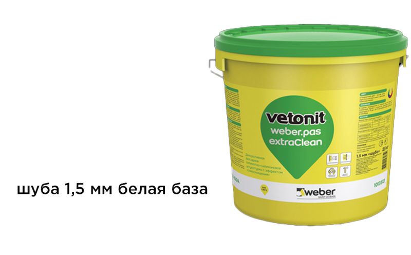 weber.pas extraClean шуба 1,5 мм А100 — силикатно-силиконовая декоративная самоочищающаяся штукатурка белого цвета. База колеруется во все цвета, кроме ярких, делает любой колер пастельным. Штукатурку можно наносить без колеровки.